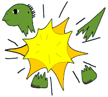 "Was zum großen Dino war das denn?", dachte sich unser grüner Freund und versuchte zunächst recht erfolglos, wieder auf die Beine zu kommen. Schließlich stand er jedoch wieder auf seinen Füßen, und begutachtete die Sauerei...