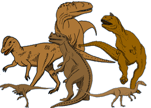 ![]() Einige Ceratosauria: Masiakasaurus, Dilophosaurus, Ceratosaurus, Abelisaurus, Carnotaurus, Coelophysis |